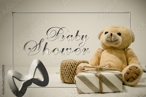 Teddy Bear Soft Toy With A Gift Box And Text Baby Shower Tags Or