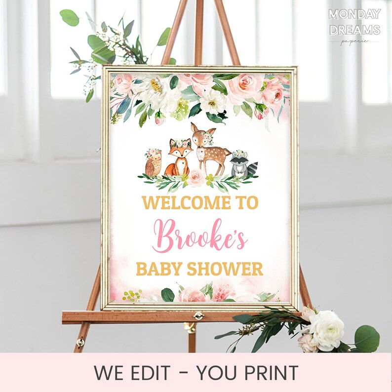 Floral Woodland Baby Shower Welcome Sign Girl Blush Pink Woodland Party Welcome Sign Woodland Baby Shower Theme Forest Baby Shower Bbs145