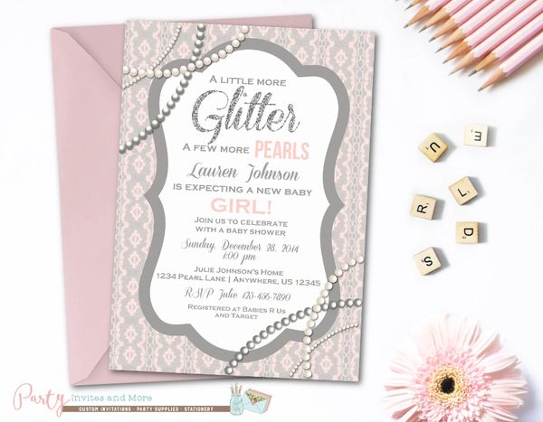 Pearls And Lace Baby Shower Invitation Glitter Baby Shower Invitation Girl Baby Shower Invitation Shabby Chic Baby Shower Invitation